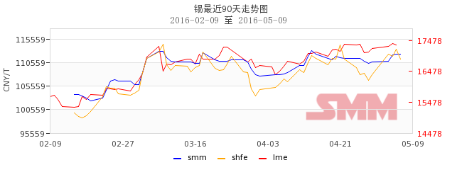 SMM錫簡評:今日開盤112340元/噸,受到周末公布的中國4月對外貿(mào)易數(shù)據(jù)疲弱的打壓,國內(nèi)商品市場普遍遭遇重挫,滬期錫主力一路震蕩下行,最低觸及110030 元/噸,最終收盤110770元/噸,較前一日下跌590元/噸,跌幅0.53%。成交33068手減8242手,持倉10624手減242手。