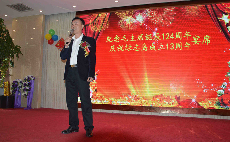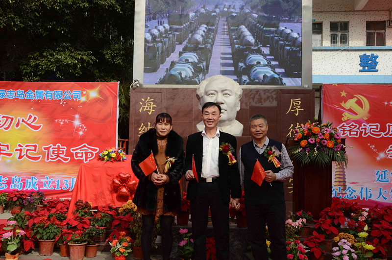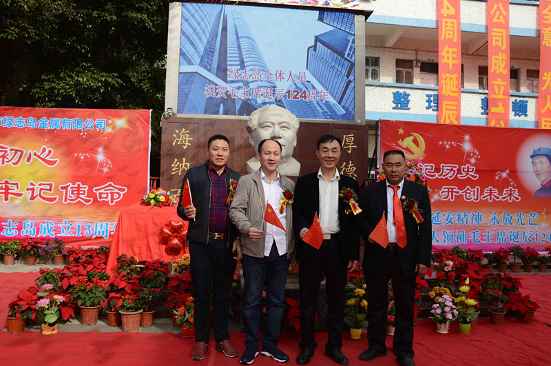 綠志島實業(yè)由來自湖南的朱祖生先生創(chuàng)業(yè)于2000年,由最初的錫渣冶煉廠經過十來年的艱苦奮斗,現(xiàn)在公司產品包括焊錫條、焊錫絲、焊錫膏,助焊劑,清洗劑,防銹劑,潤滑油等。綠志島實業(yè)的發(fā)展,在以毛主席思想為信仰的指引下突飛猛進,在“吃水不忘挖井人”的感恩心下穩(wěn)步發(fā)展。為了鞏固毛主席思想作為綠志島的信仰核心,綠志島于2012年12月26日從泰山迎接來毛主席泰山石像,并立于公司內部。自此,綠志島每年12月26日都會齊聚眾多認同毛主席的朋友,在綠志島內緬懷紀念毛主席。2017年是綠志島舉辦毛主席誕辰第六年,為此和志同道合的朋友們齊聚一堂,共慶毛主席誕辰。