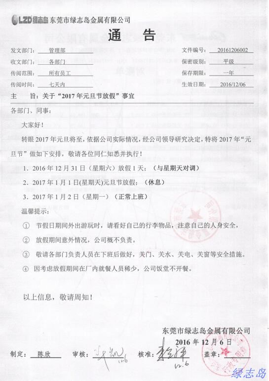 2017元旦放假通知-綠志島-領(lǐng)先綠色科技